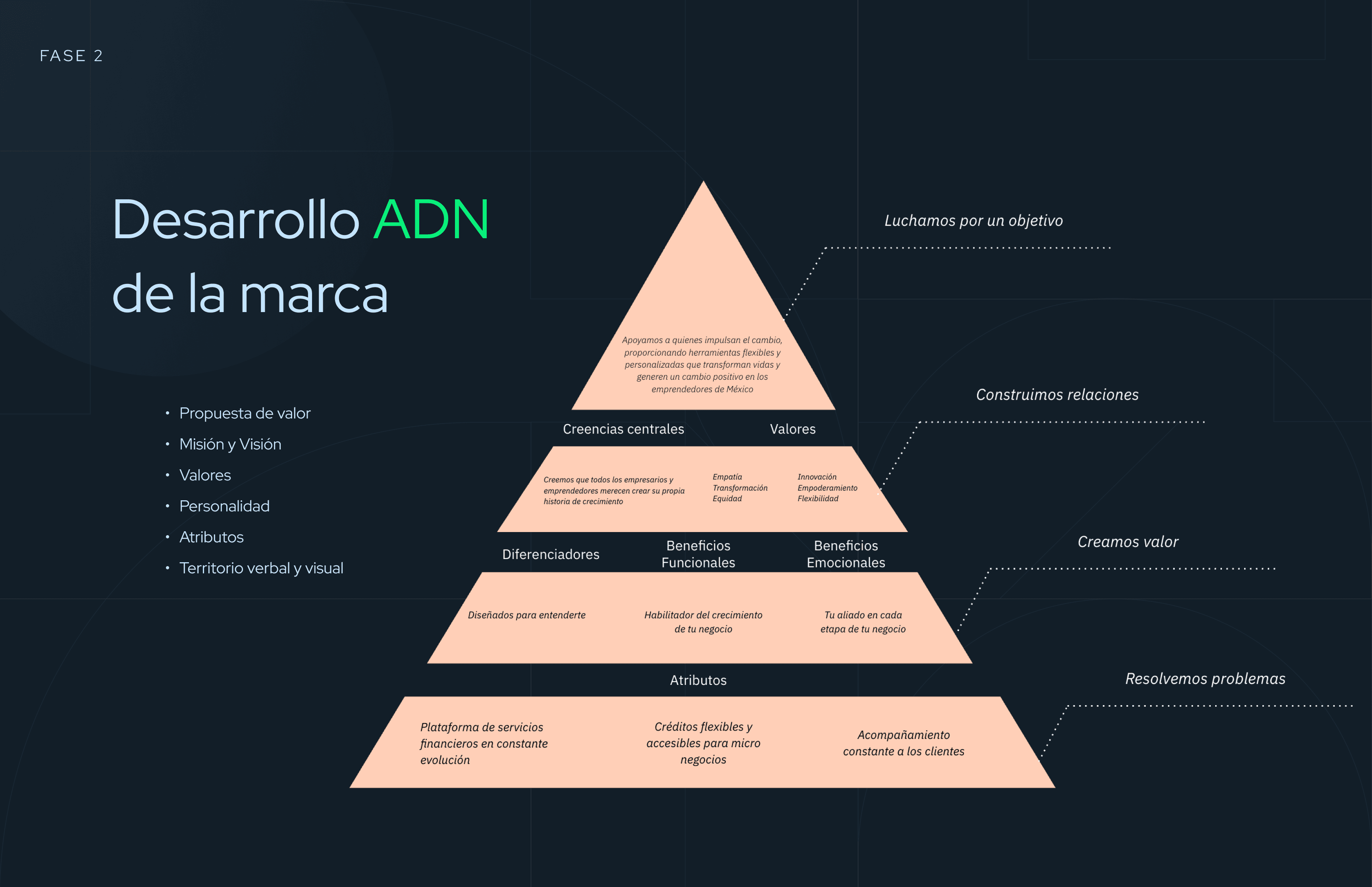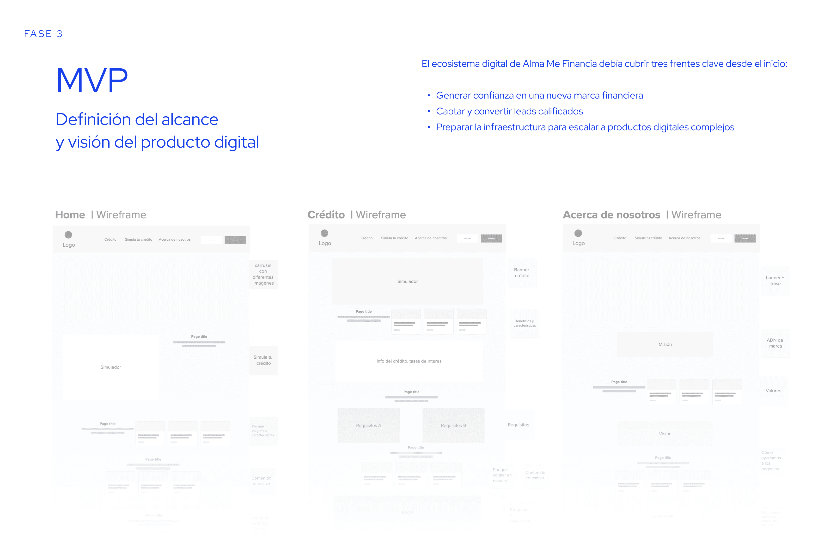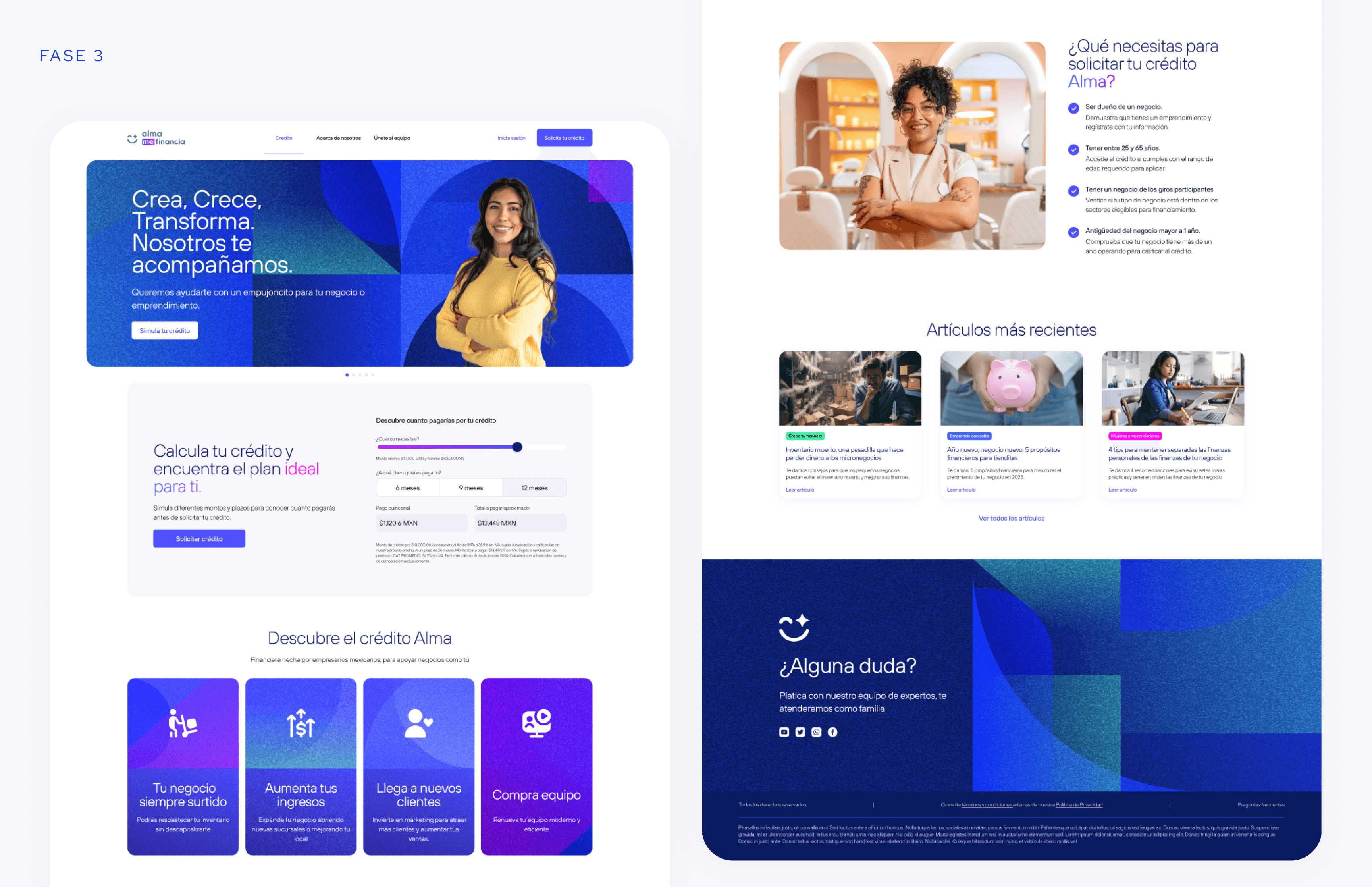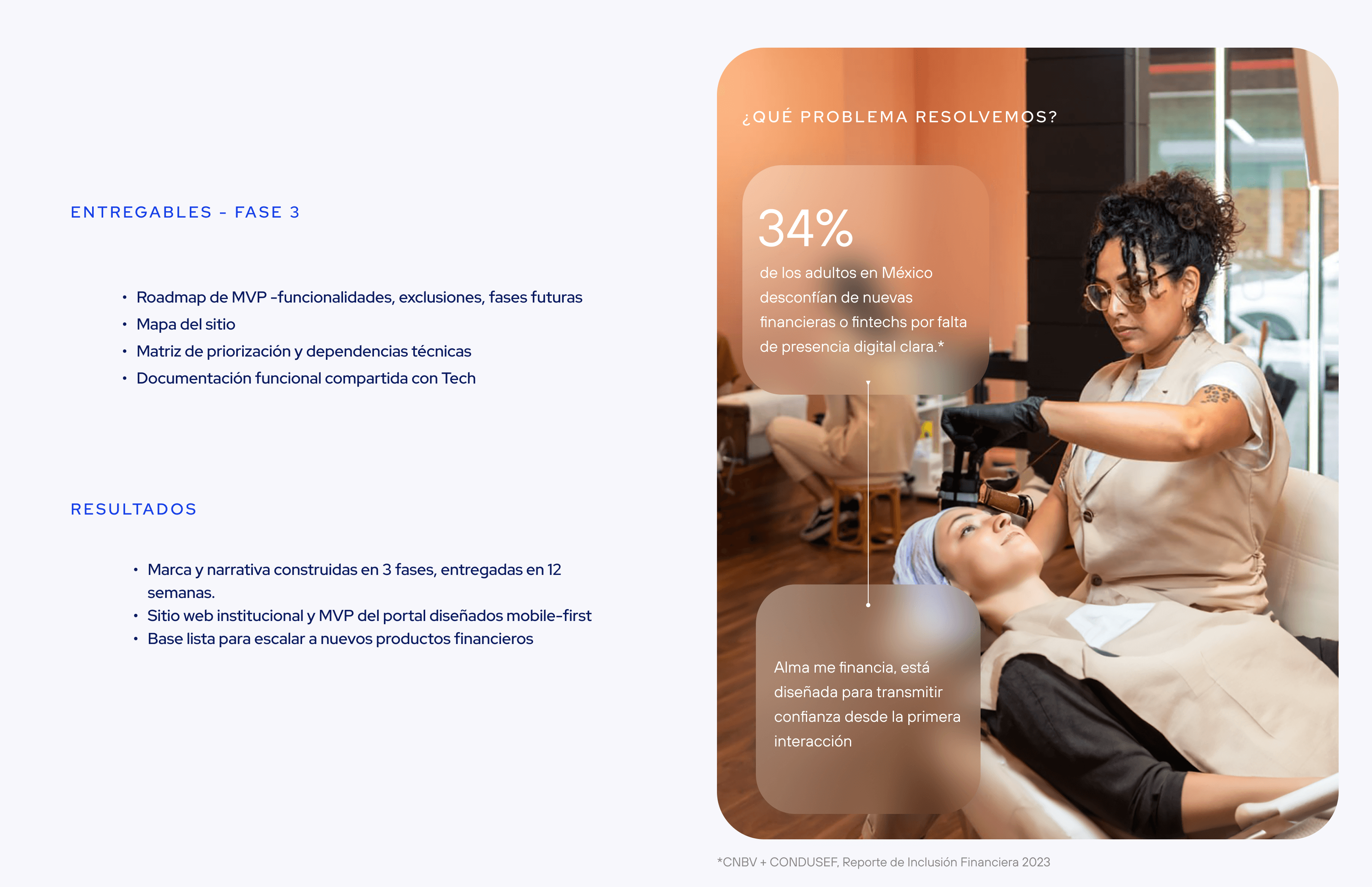 Mi enfoque combinó dirección creativa, estrategia de producto y pensamiento de diseño para asegurar que Alma Me Financia naciera con una identidad clara, empática y escalable.